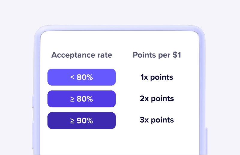 Get one point for every dollar you earn, whenever you drive. With a high acceptance rate, you can earn 2-3 points per dollar.1