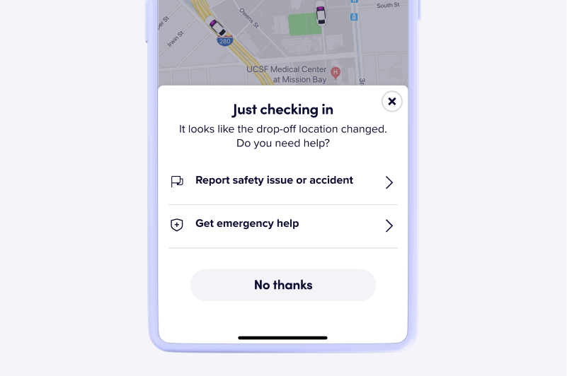 We monitor rides for unusual activity, like long stops or route deviations. If we notice anything off about your ride, we’ll contact you to see if you need help with Smart Trip Check-In.